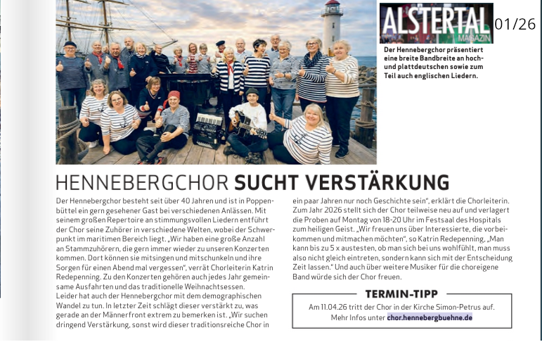 Im Oktober 2023 feierte der Henneberg Chor (ehemals Shanty Chor) der Henneberg Bühne Poppenbüttel e.V. sein 30jähriges Bestehen.